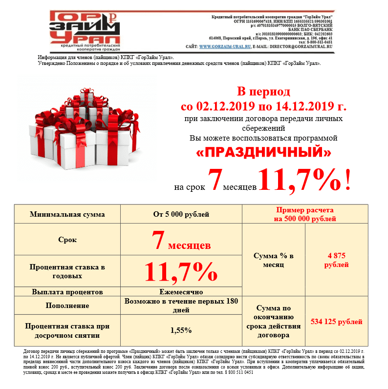 В период с 02.12.2019 по 14.12.2019 гг. при заключении договора передачи личных сбережений Вы можете воспользоваться программой «ПРАЗДНИЧНЫЙ» на срок 7 месяцев под 11,7 % годовых!