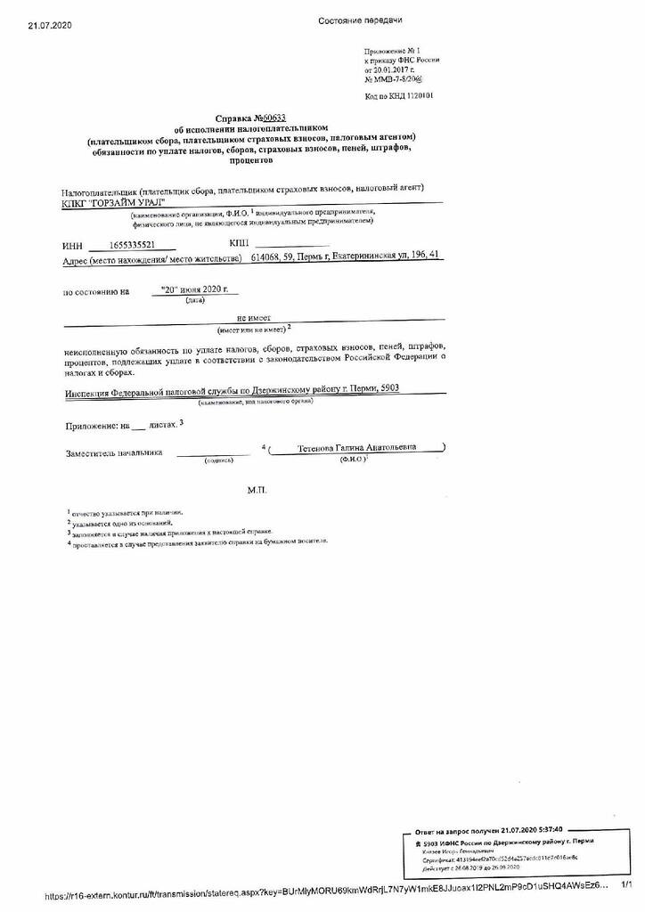 КПКГ «ГорЗайм Урал» за полугодие 2020 г., как налогоплательщик, выполнил все свои обязательства. Начисление налогов и взносов и их перечисление в государственные органы в течение полугодия 2020года производились своевременно и в полном объёме. КПКГ «ГорЗайм Урал» не имеет неисполненных обязательств по уплате налогов и сборов по состоянию на 20 июля 2020 г., в соответствии с законодательством Российской Федерации о налогах и сборах, что подтверждает справка №60633, выданная ИФНС по Дзержинскому району г. Перми.