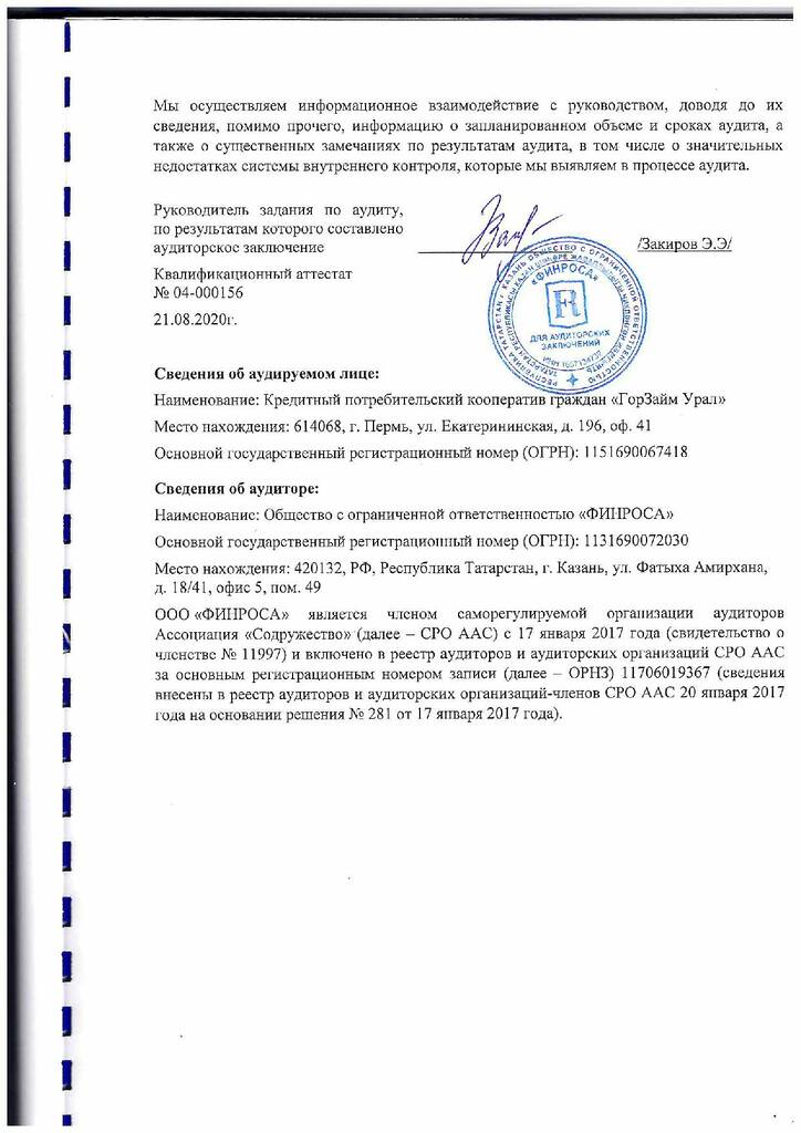 аУДИТОРСКОЕ ЗАКЛЮЧЕНИЕ КПКГ «горЗайм Урал» зА 2019 гОД!