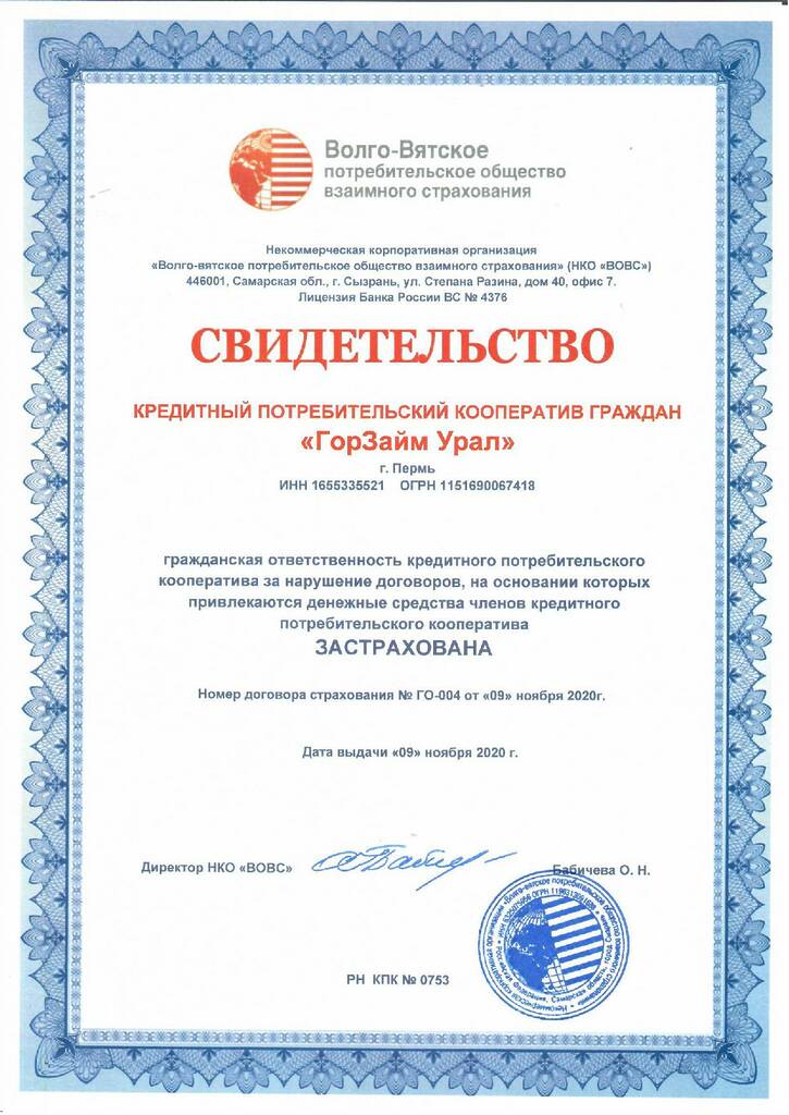 Гражданская ответственность КПКГ «ГорЗайм Урал» за нарушение договоров, на основании которых привлекаются денежные средства пайщиков, застрахована в НКО «ВОВС» (ИНН 6325075056, ОГРН 1196313091688, Лицензия ВС №4376 Центрального банка РФ). Договор страхования № ГО-004 от 09.11.2020 г.)