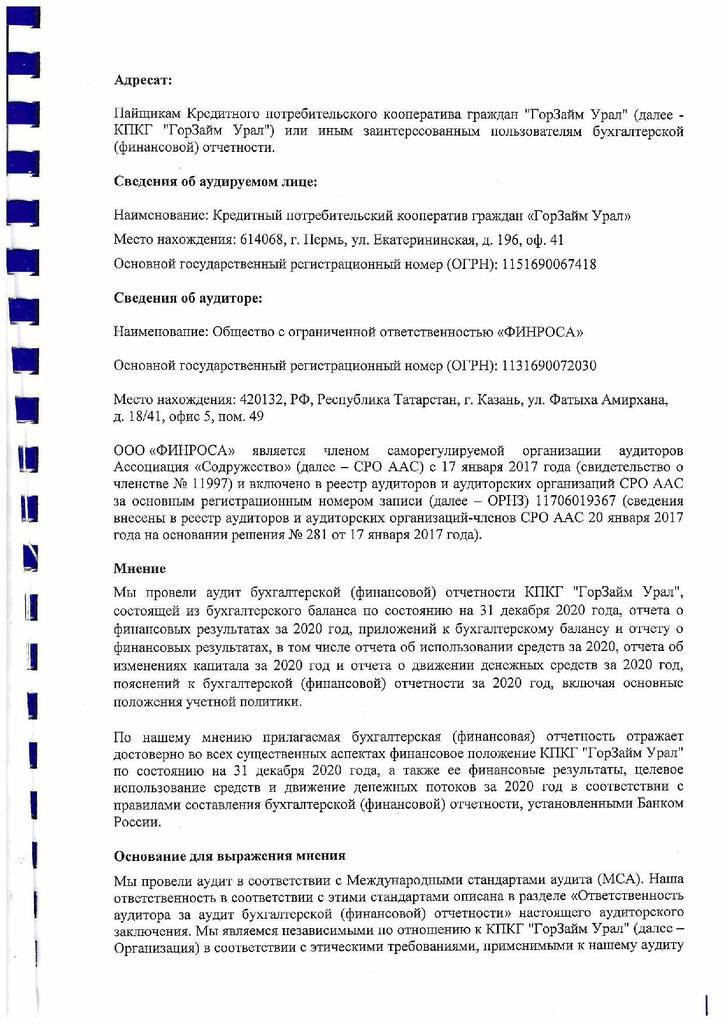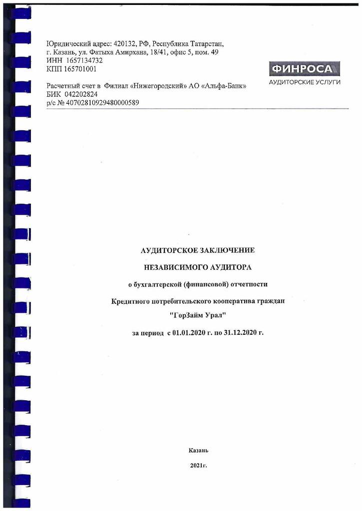 ООО «ФИНРОСА» осуществило аудит бухгалтерской отчетности КПКГ «ГорЗайм Урал» , состоящей из бухгалтерского баланса по состоянию на 31 декабря 2020 года, отчета о финансовых результатах за 2020 год, приложений к бухгалтерскому балансу и отчету о финансовых результатах, в том числе отчета об использовании средств за 2020 год, отчета об изменениях капитала за 2020 год и отчета о движении денежных средств за 2020 год, , пояснений к бухгалтерской (финансовой) отчетности за 2020 год, включая основные положения учетной политики.