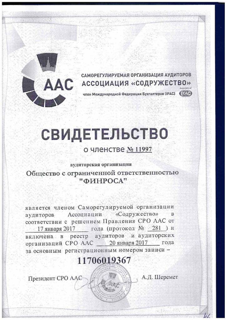 ООО «ФИНРОСА» является членом саморегулируемой организации аудиторов Ассоциация «Содружество» с 17 января 2017 года (Свидетельство о членстве № 11997) и включено в реестр аудиторов и аудиторских организаций СРО ААС за основным регистрационным номером записи 11706019367.