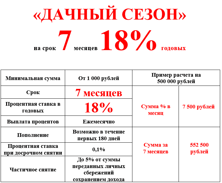 Договор передачи личных сбережений по программе “Дачный сезон” может быть заключен только с членами (пайщиками) КПКГ«ГорЗайм Урал» в период с 01.06.2022г. по 30.06.2022г. Не является публичной офертой. Член (пайщик) КПКГ«ГорЗайм Урал» обязан солидарно нести субсидиарную ответственность по своим обязательствам в пределах невнесенной части дополнительного взноса каждого из членов(пайщиков) КПКГ«ГорЗайм Урал». При вступлении в кооператив уплачивается обязательный паевой взнос 50 руб., вступительный взнос 50 руб. Заключение договора после ознакомления со всеми условиями в офисе. Дополнительную информацию об акции, условиях, сроках и месте ее проведения можете получить в офисах КПКГ«ГорЗайм Урал» или по тел.8 8-800-511-04-51