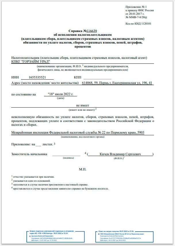 Отчеты по форме 6-НДФЛ по доходам сотрудников, арендодателей и сберегателей, исчисленных и удержанных налоговым агентом, а также Расчет по страховым взносам сданы в ИФНС своевременно. Начисления налогов и взносов и их отчисления в государственные органы за полугодие 2022г. производились своевременно и в полном объёме. В установленные сроки были оплачены членские взносы и взносы в компенсационный фонд в Ассоциацию “Саморегулируемая организация кредитных кооперативов “Содействие”, авансовый платеж по налогу, уплачиваемый в связи с применением УСН. КПКГ «ГорЗайм Урал» не имеет неисполненных обязательств по уплате налогов и сборов в соответствии с законодательством Российской Федерации о налогах и сборах по состоянию на 18 июля 2022 г., что подтверждает справка №16639, выданная Межрайонной ИФНС России №22 по Пермскому краю.