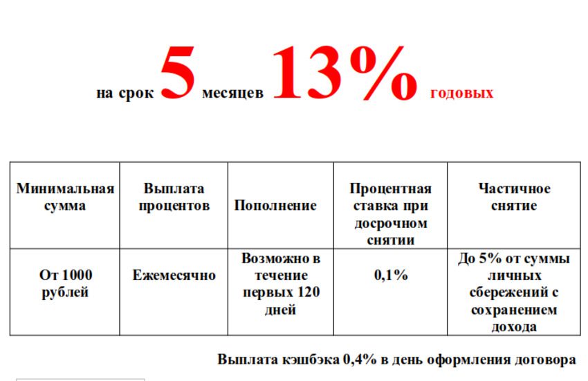 Договор передачи личных сбережений по акционной программе “Только плюсы” может быть заключен только с членами (пайщиками) КПКГ«ГорЗайм Урал» в период с 01.04.2023г. по 30.04.2023г. Не является публичной офертой. В день заключения договора осуществляется выплата кэшбэка в размере 0,4% (процентов годовых) от суммы переданных личных сбережений. Выплата, подлежит возврату, в случаях частичного снятия денежных средств по договору или полного досрочного расторжения договора передачи личных сбережений. Член (пайщик) КПКГ«ГорЗайм Урал» обязан солидарно нести субсидиарную ответственность по своим обязательствам в пределах невнесенной части дополнительного взноса каждого из членов(пайщиков) КПКГ«ГорЗайм Урал». При вступлении в кооператив уплачивается обязательный паевой взнос 50 руб., вступительный взнос 50 руб. Заключение договора после ознакомления со всеми условиями в офисе. Дополнительную информацию об акционной программе, условиях, сроках и месте ее проведения можете получить в офисах КПКГ«ГорЗайм Урал» или по тел.8 8-800-511-04-51